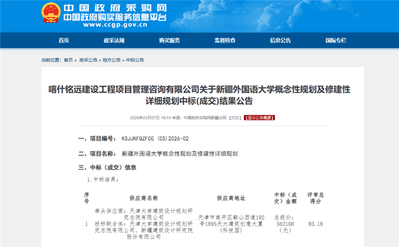 近日,中国政府采购网发布关于新疆外国语大学概念性规划及修建性详细规划中标(成交)结果公告。采购人为新疆外国语大学筹建工作组、喀什经济开发区管理委员会、喀什经济开发区规划土地建设环保局。