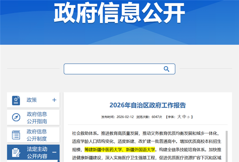 此前1月27日发布的2026年新疆维吾尔自治区政府工作报告提到:增加优质高校本科招生规模,筹建新疆中医药大学、新疆外国语大学。