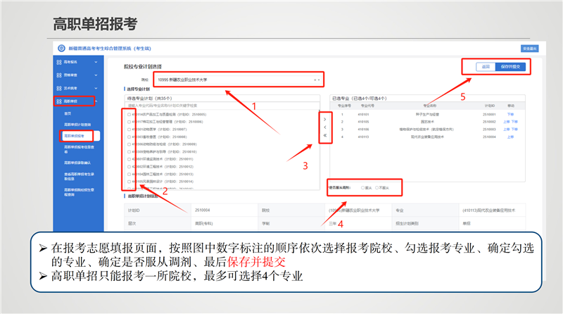 4月8日10时至12日18时,考生可登录自治区教育考试院官方网站(https://www.xjzk.gov.cn,下同),选择“公众服务大厅-网上报名”栏目,进入“新疆高职单招报名”系统,认真阅读“2026年高职单招考生诚信承诺书”并承诺诚信考试,进行网上报名及志愿填报。考生可选择填报一所院校的4个专业,并选择是否服从专业调剂。在规定时间内,考生可在“新疆高职单招报名”系统实时查看各院校动态报名人数并进行志愿修改。考生最终志愿以“新疆高职单招报名”系统最后一次保存的志愿数据为准,填报时间截止后不得更改或补报。
