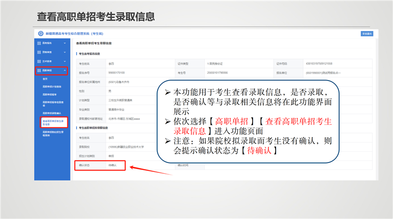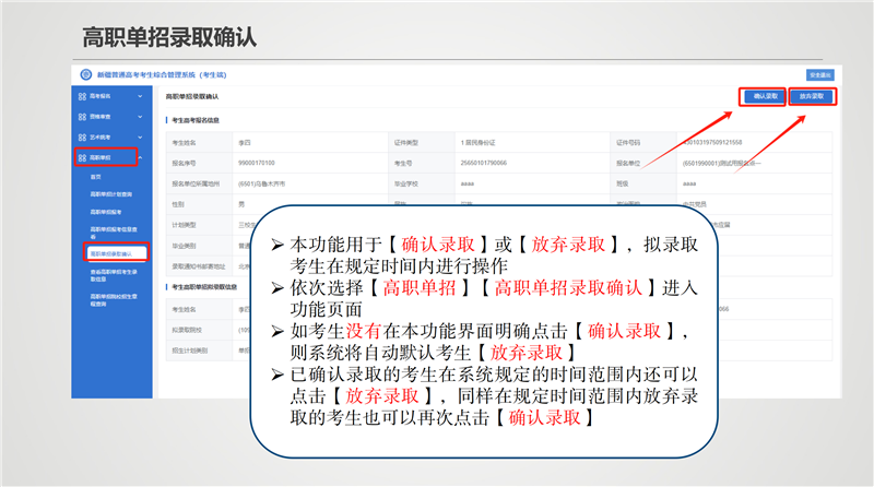 4月20日至21日,各招生院校依据招生章程进行录取、网上公示拟录取考生名单。拟录取考生须于4月26日10时至28日18时,登录自治区教育考试院官方网站,进入“新疆高职单招报名”系统,点击“确认录取”,并通过短信验证后,方为确认录取;点击“放弃录取”和未进行操作的考生,均视为放弃本次高职单招录取。考生确认录取后的名单为招生院校最终录取名单。