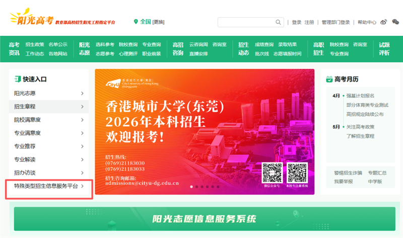 进入阳光高考网(https://gaokao.chsi.com.cn/),左侧快速入口“特殊类型招生信息服务平台”点击进入。