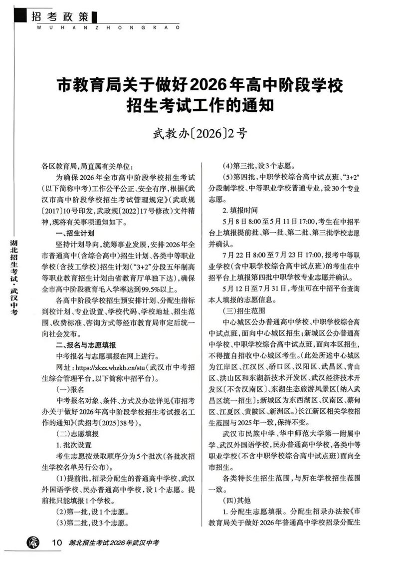 武汉教育电视台4月24日报道指出,本台记者通过查阅武汉市教育局发布的《关于做好2026年高中阶段学校招生考试工作的通知》发现,今年武汉市中考报名人数10.6万人,普高招生总计划为85249人,其中公办高中招生68619人,民办高中招生8630人,中职学校综合高中试点班招生8000人。相较2025年,普高计划净增12430人,其中公办高中增加6205人,民办高中增加1025人。经测算,武汉市今年普高率有望达到80%以上。