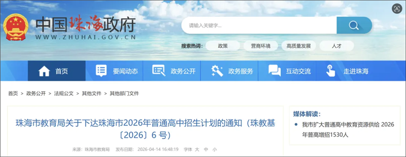 上述报道表示,此次招生计划的发布,标志着珠海市进一步扩大普通高中教育资源供给,优化高中阶段教育结构,更好满足市民对优质公办普高学位的需求。
